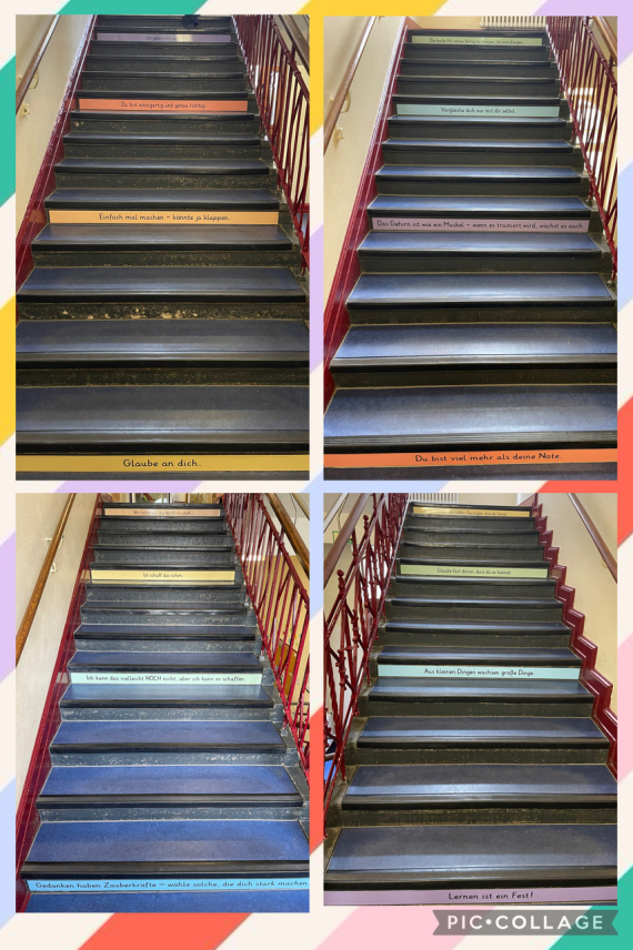 Auf mehreren Stufe befinden sich bunte Schilder mit motivierenden Sprüchen, die unseren Schülerinnen und Schülern Mut machen und sie stärken sollen. Schritt für Schritt entdecken die Kinder neue positive Botschaften – kleine Gedanken, die Kraft geben, Freude machen und an das eigene Können erinnern. Einige Schilder sind sogar in verschiedenen Sprachen gestaltet.