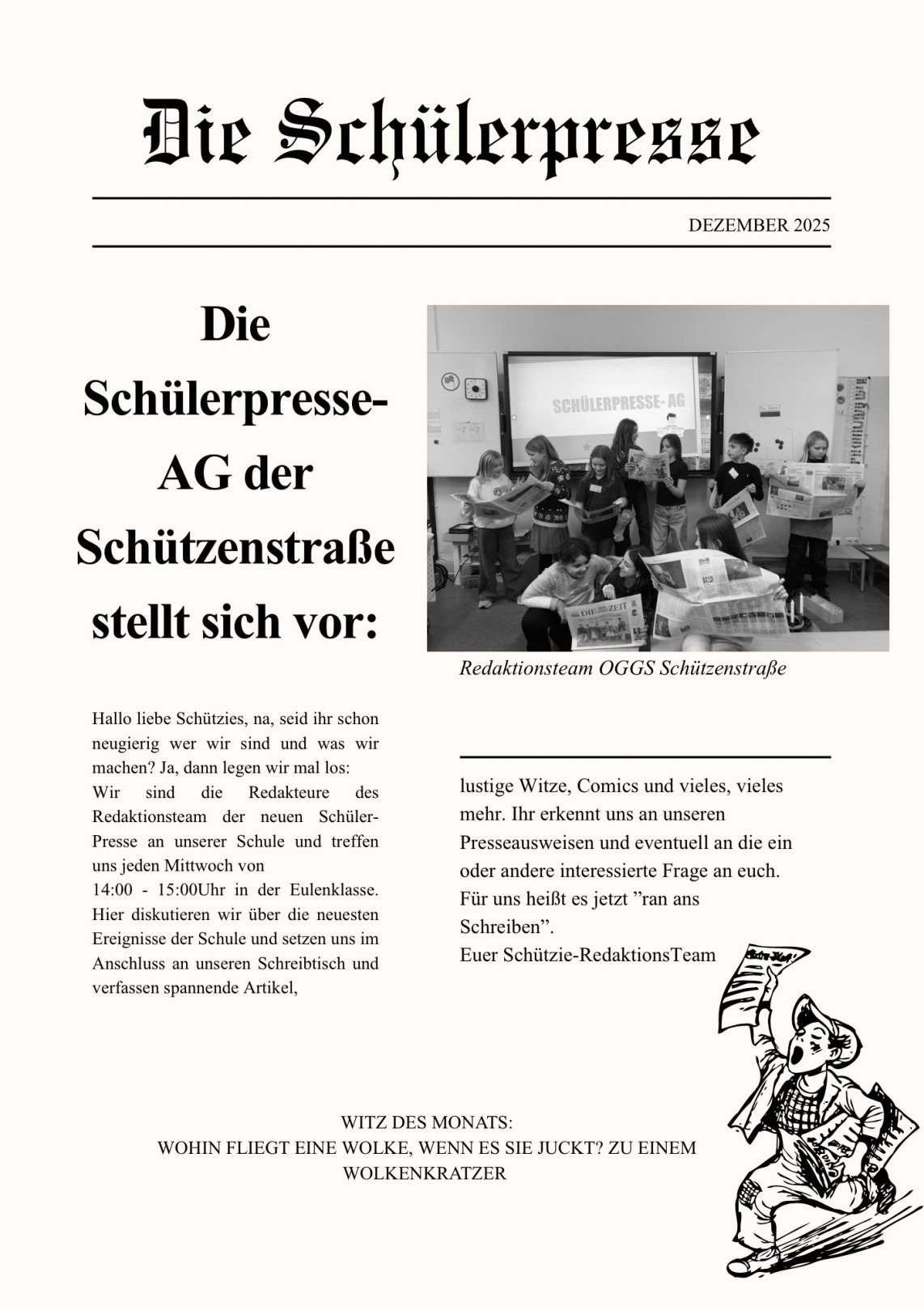 Jeden Mittwoch von 14:00 bis 15:00 Uhr trifft sich das Redaktionsteam in der Eulenklasse. Dort werden Ideen gesammelt, Interviews geplant, Artikel geschrieben sowie Witze und kleine Comics gestaltet. Gemeinsam wird diskutiert, recherchiert, überarbeitet – und natürlich auch viel gelacht.