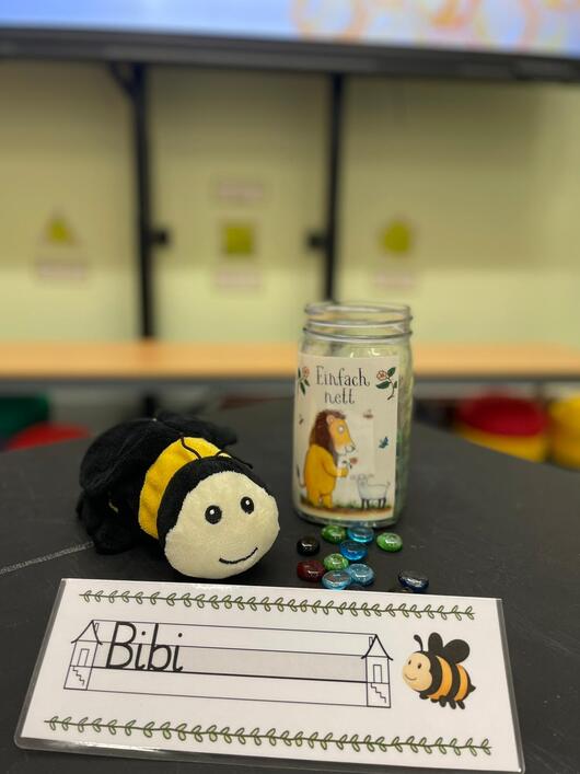 Ich bin Bibi, das Klassentier der Bienenklasse. Wir lernen, spielen, lachen und singen ganz oben im Schulgebäude.